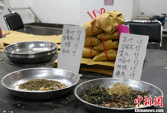 4月7日,记者在浙江省中医院中药房内看到,桌上摆放着已配置好的中药。中新社发 李晨韵 摄