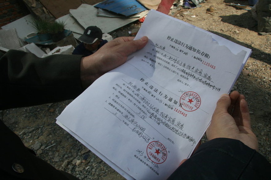 2013年4月10日,南京市白下区城市管理行政执法局的同志来到该区西一新村36号大院,对该大院内饲养鸡的居民进行现场处罚。南京市城管局近日发出了“最后通牒”,4月9日24点前,南京市区范围内(涉农除外)居民须自行处理饲养的家禽家畜(鸡、鸭、鹅、食用鸽、兔、羊)。图为4月10日,在执法人员的监督下,饲养人将两只鸡当场杀掉。