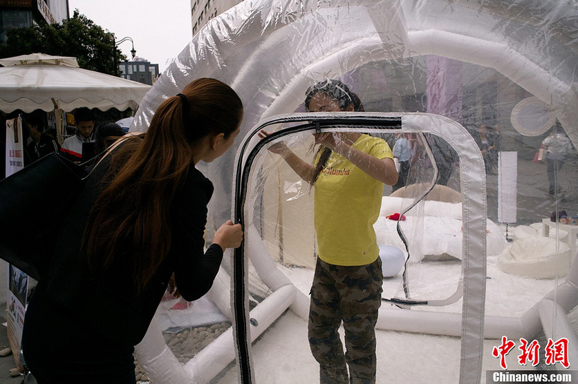 4月7日,四川一景区为做宣传别出心裁,将其推出的透明“气泡酒店”安置于繁华的成都春熙路,在这间“酒店”里,沙发、大床、衣柜、桌椅样样俱全,景区还安排了一美女模特在这间透明的“气泡酒店”里生活两天供参观,以此吸引民众。据介绍,该景区通过这一行为艺术来推广其全透明景观房,让前来的游客可以选择景点安营扎寨,以达到360度亲近大自然的效果。图为生活在“气泡酒店”的模特儿。张浪摄