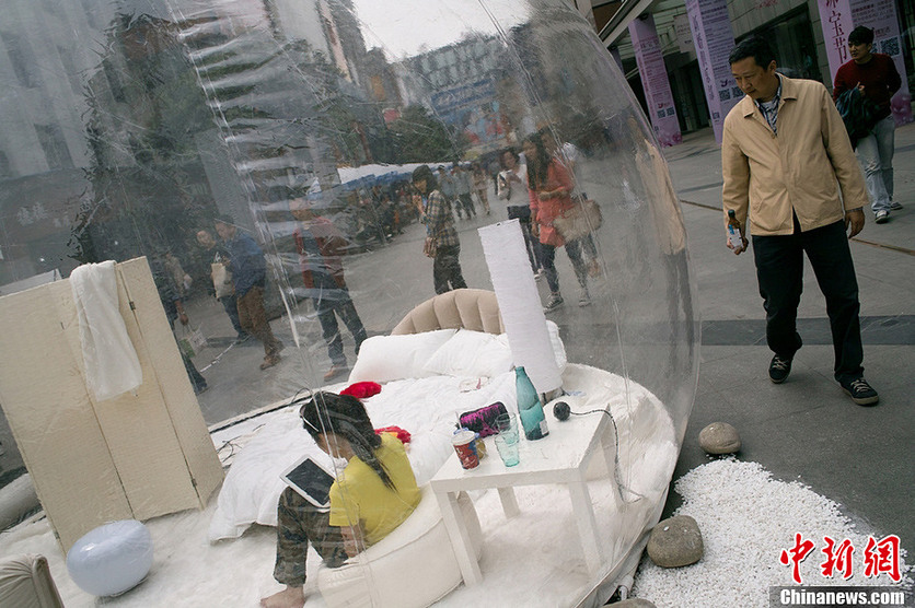 “气泡酒店”亮相闹市 美女将生活两天供参观