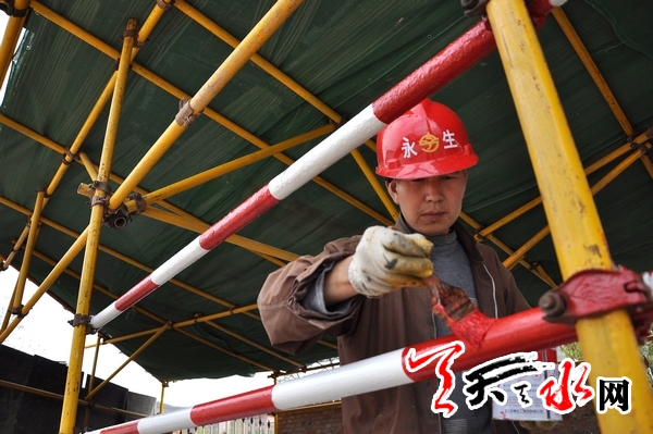 近日,工人在天水建筑科技中心建设工地油漆护栏。天水建筑科技中心设计建筑总高度为99.7米,总建筑面积为33780.87平方米,地上28层,地下2层,为全框架剪力墙结构。工程建设中将采用屈曲约束支撑、太阳能光伏发电、智能建筑、太阳能集热、水源热泵、光导管照明、中水回收利用、土建装修设计一体化等建筑领域新技术、新工艺。工程建成后,将成为集建筑勘察设计、工程招投标交易、数字化城市管理、城市规划成果展览、建筑工程咨询、建筑科技研究、建设工程质检、城市档案管理、教育科技培训和会务旅游服务等多功能为一体的超高层建筑。本报记者 孙镇 摄