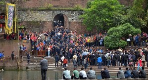4月11日,凤凰古城,北门码头外聚集了大量的当地居民和商户。