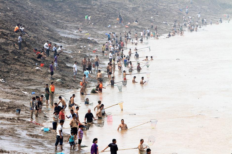 自2002年起,黄河调水调沙工程每年进行一次,从而减轻黄河河道淤积。7月4日凌时许,河南三门峡大坝黄河调水调沙开始。黄河两岸滩涂、浅滩、浑浊的水流形成罕见的溜鱼现象。成千群众不顾危险,争先恐后下水捡鱼、捞鱼,现场场面壮观。其中一些妇女、小孩儿、老人也参与其中。图为人们在黄河岸边捞鱼。