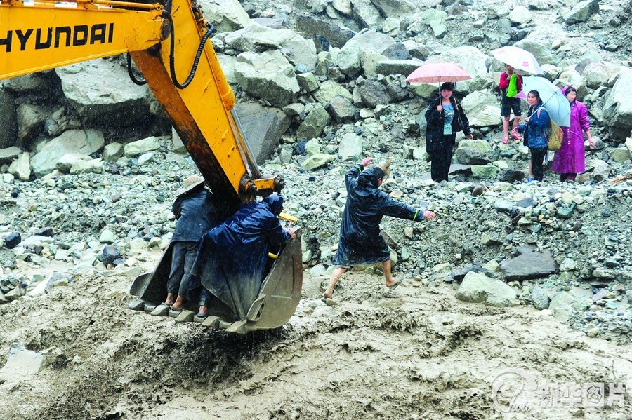 在挖掘机屹立的乱石堆下,岷江河道已被泥沙填上了一半,落差达50多米。