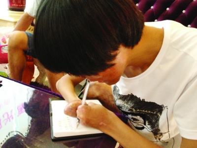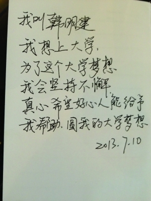 采访结束时,韩明建用双手夹着笔给记者写下了一段话:“我叫韩明建,我想上大学,为了这个大学梦想,我会坚持不懈,真心希望好心人能给予我帮助,圆我的大学梦想。”