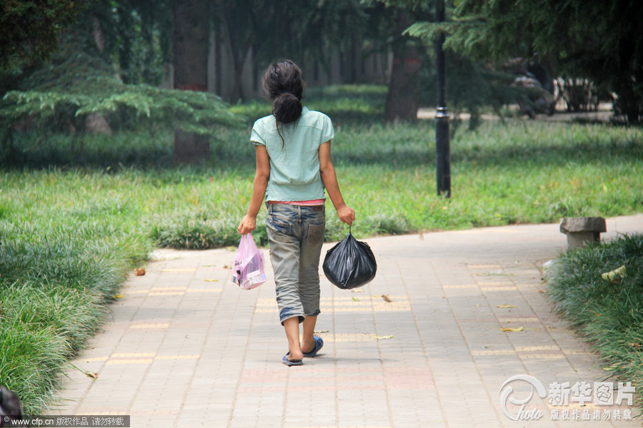 2013年7月15日,郑州,人多的时候,她会拿着东西,到河堤的其他地方睡觉。