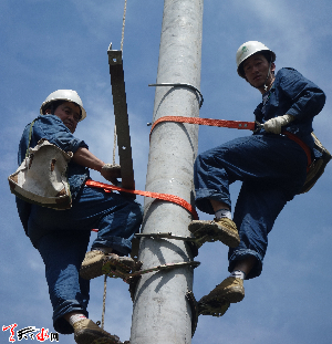 近期,持续不断的强降雨,导致秦州区娘娘坝镇一个月遭遇两次洪涝灾害,电力设施遭受破坏。图为7月16日上午,秦州区农电局汪川农电所的工作人员正在积极抢修秦州区娘娘坝镇娘娘坝村杨家鞍子路段的受损线路。 本报记者余碧波