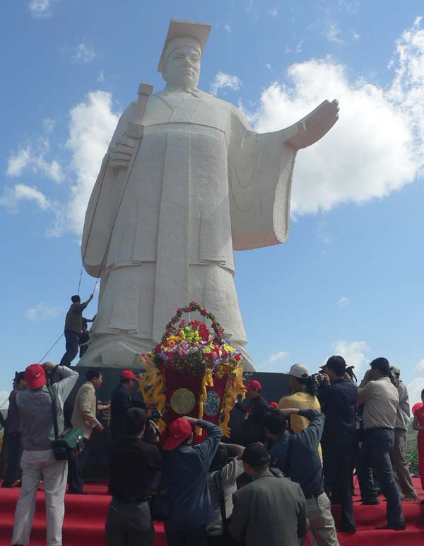 在将要竣工的广场上,工人们在进行着雕像的后期工作。潘先生在雕像的下边,给工作人员边比划边安顿。轩辕黄帝的塑像高9.5米,基座3米,雕塑加上基座,总重量超过百吨。潘先生说,轩辕身高9.5米,表明了九五之尊的意思。