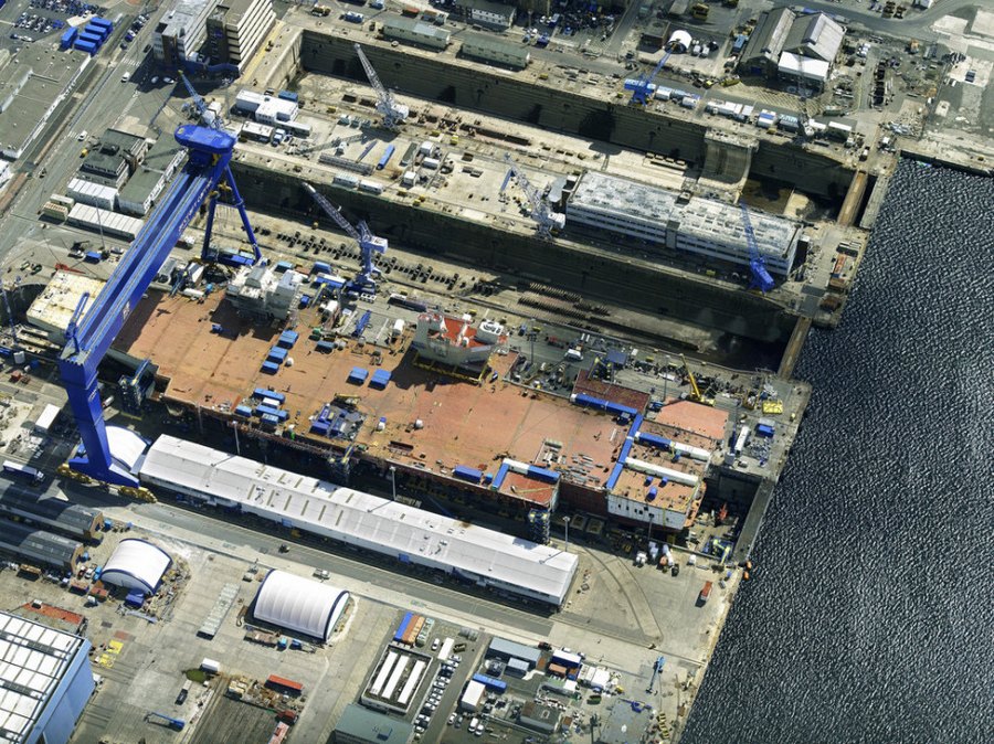 英国皇家海军最新型“伊丽莎白女王”号航母后舰岛于6月28日在乐塞船厂完成安装,至此,两个舰岛均已经安装完毕。7月1日,英国媒体乘机在船厂上空对“伊丽莎白女王”号进行了航拍。图中能看到该航母主体建筑已经基本成形,外形轮廓也已经显现。(来源:环球网)