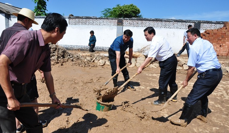 (在清水县红堡镇蔡湾村,杨维俊和县上干部群众一道清运淤泥)