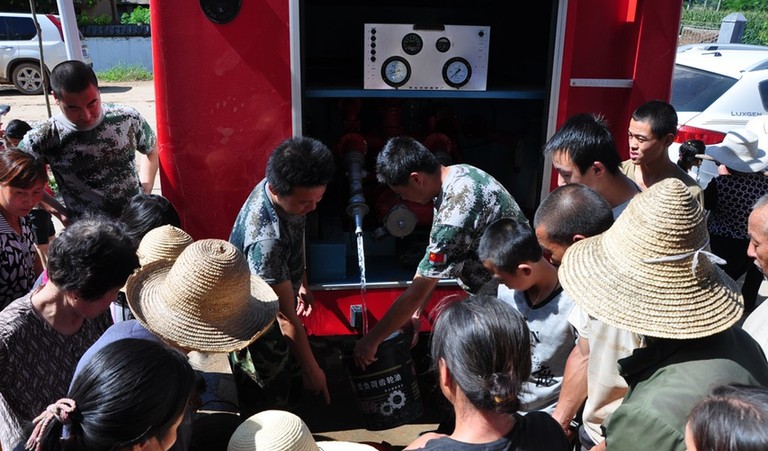 (清水县蔡湾村,消防战士给村民送来了可以饮用的自来水)