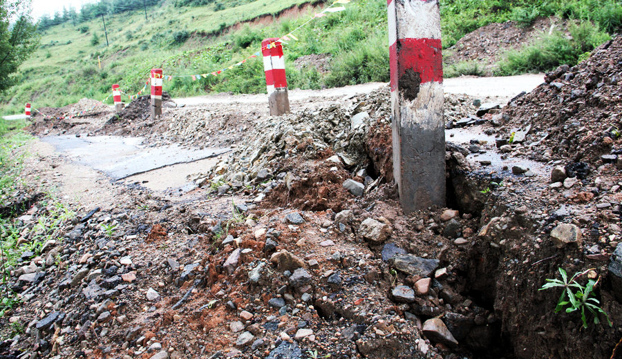 抢险一线,时间就是生命。记者在抢险救灾一线看到,铲车正在不停息地作业着,抢险人员奋力除险,抢险救灾工作正在紧张进行。“接到救援任务,我们就赶来了,当时看到的是,道路完全塌陷,大约有50米中断。按照抢险救灾应急方案,我们机械作业和人工抢险双管齐下,抢时间,赶进度,为的是尽快保证道路的安全通行。”抢险人员王国旺对记者说,由于路基塌陷、路面断裂严重,目前抢修的便道只能保障小型车辆的安全通行。
