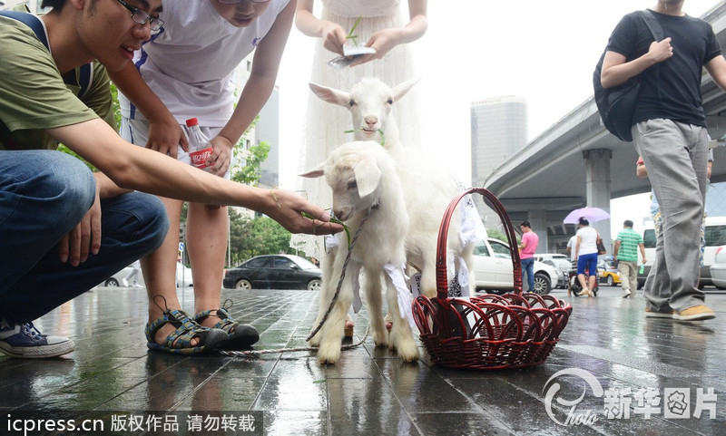 2013年7月29日中午左右,北京CBD商圈,一女子牵着2只可爱的小羊,绕着商圈边走边放羊,并不时地用青草喂小羊,而小羊则不时闻舔着绿化带的花花草草。现场除了引来路人围观,也招来人们非议,担心小羊拉屎撒尿弄脏小区、啃食花草。“牧羊女”则很淡定,没把这些当回事继续放羊。经了解得知,“牧羊女”是一家传媒公司的职员,两只可爱的小羊是来自澳大利亚的山羊,今天将自己的宠物拉出来遛遛是为了减压,让自己过得更积极,更轻松。