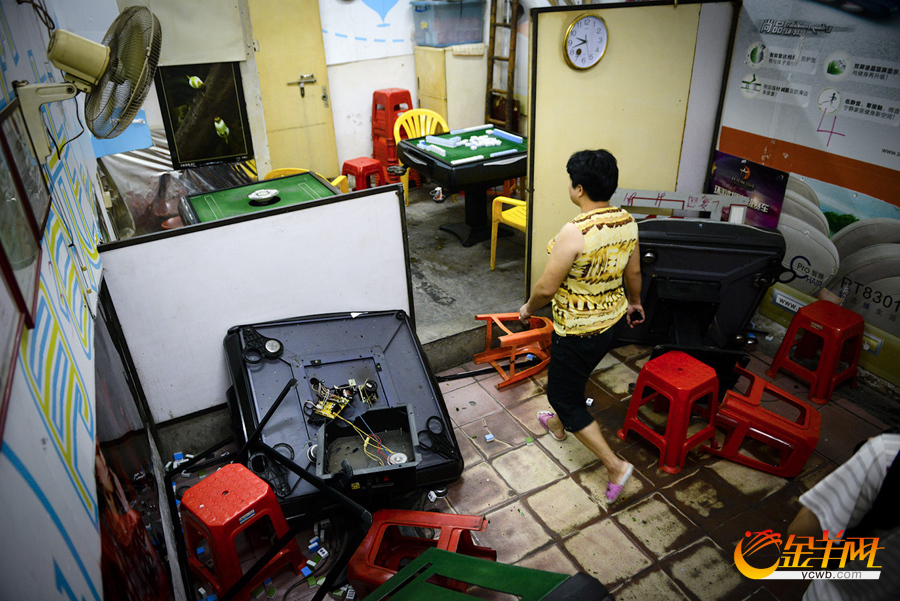 事发后,棋牌室老板的姐姐闻讯赶来,当事棋牌室已被掀翻砸烂。羊城晚报记者 艾修煜 摄