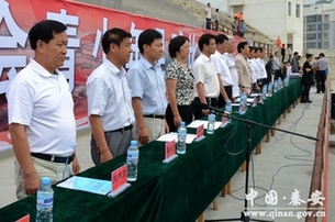 7月29日,天水市第四届运动会青少年男子足球赛在秦安县体育中心举行开幕式。天水市第四届运动会组委会副主任、秘书长、市体育局局长黄啸,市四运会组委会委员、市体育局副局长李爱平,秦安县委常委、宣传部长李爱仙,县人大常委会副主任魏千乙,县政府副县长罗增芳,县政协副主席马振寰出席开幕式。市县相关部门负责人,市县代表队的运动员、教练员、裁判员,以及城区部分干部职工和群众参加开幕式并观看比赛。