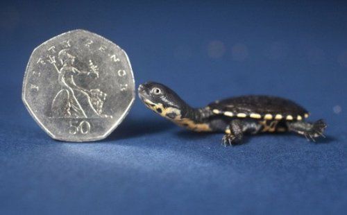 刚出生一个星期的罗蒂岛蛇颈龟,其体型与硬币大小相当(网络图片)