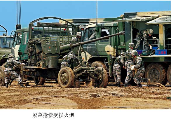 一个波次的轰炸过后,一门火炮的零件被炸得七零八落。请求技术支援的信号通过网络迅速传到指挥中心装备修理方舱的屏幕上,多名修理专家根据前方提供的火炮伤情,快速在网上会诊;抢修分队按网上发来的“诊断书”实施快速抢修,20分钟后,受损火炮重新投入战斗。