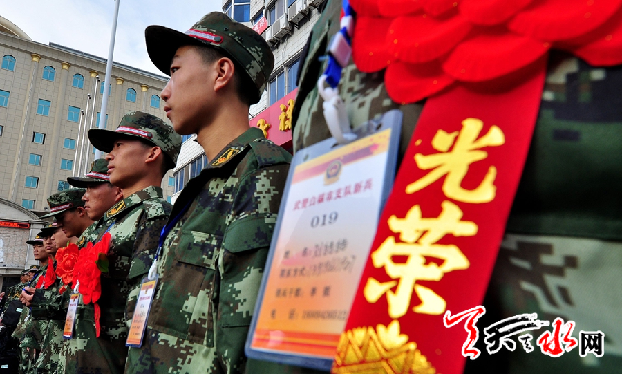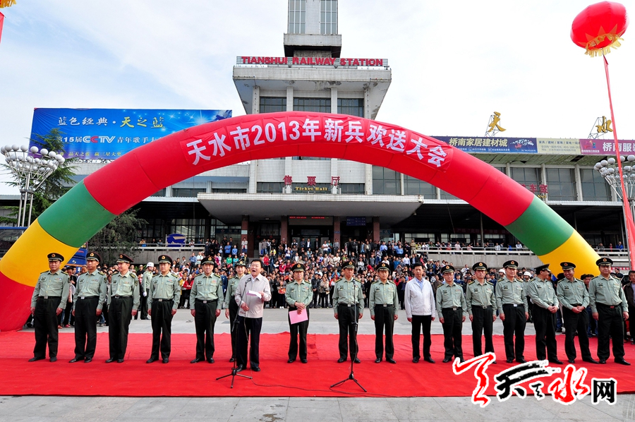 天天天水网 记者何永德 9月11日上午,天水市2013年新兵入伍欢送会在天水火车站隆重举行,来自天水市577名应征入伍的有志青年经过严格的选拔身着戎装,在社会各界人士的欢送下奔赴军营,兰州军区驻兰州铁路局军代处政治部敬瑞香主任,军分区李建中司令员,天水市征兵领导小组副组长、市政府副市长雷鸣等各成员单位负责人以及军属参加了欢送仪式。