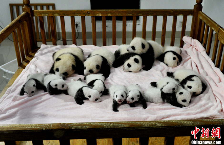 9月23日,在保证“种群质量”优先的前提下,成都圈养大熊猫繁育再获丰收,14只今年新生大熊猫宝宝集体在成都大熊猫繁育研究基地月亮产房亮相,14只熊猫宝宝萌翻前来参观的中外游客。安源 摄