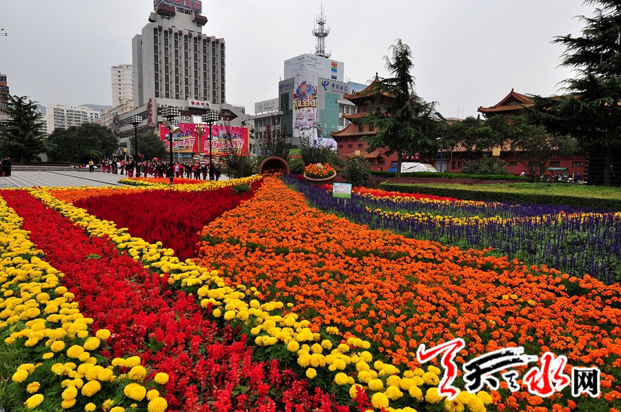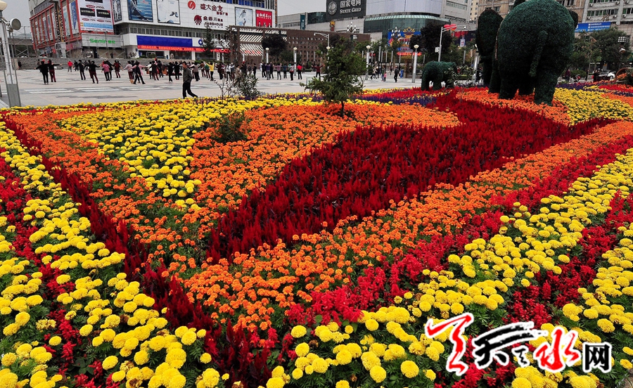 9月30日,天水市民在鲜花装点的龙城广场晨练。“十一”国庆临近,为营造节日氛围,美化城市人居环境、提升城市品位、在龙城广场,中华东、西路步行街及民主路、建设路为重点主要路段,园林部门共摆放鲜花6万余盆。装点节日的龙城。天天天水网 何永德摄