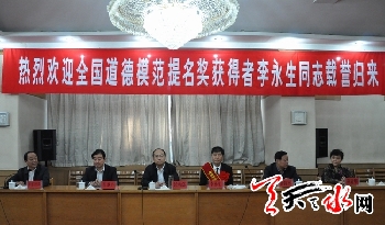 天天天水网讯【记者 王晓馨 李旺旺】9月29日,天水市在天水迎宾馆举行仪式,欢迎全国第四届道德模范提名奖获得者李永生载誉还乡。中共天水市委常委、宣传部长彭鸿嘉,天水市人大常委会副主任谢简平,天水市副市长霍卫平,天水市政协副主席何道华出席欢迎仪式。