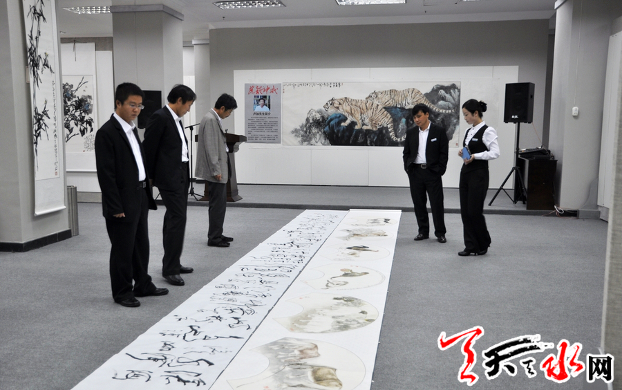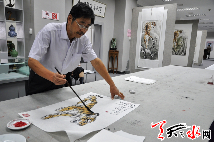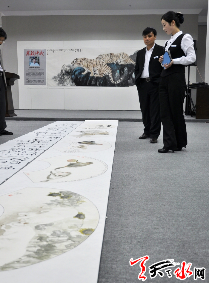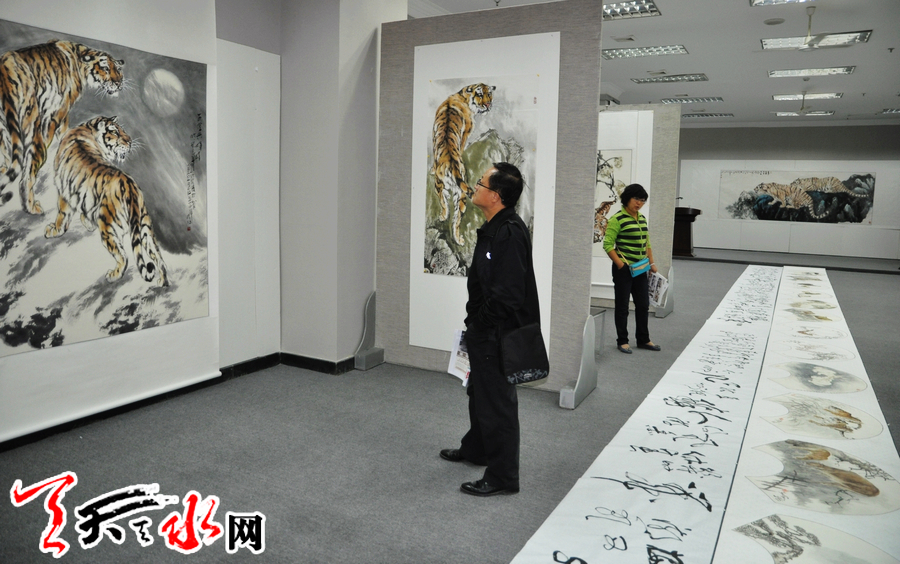 10月6日,生于山东阳谷县的卢加带着40多幅精品绘画作品在天水市金龙大厦隆重举办个展。偌大的展厅,一幅幅巨型的写虎佳作仿佛让人走进了虎的世界:形态各异、情状万种,或上山或下山,或坐卧月下,或静观或长啸的老虎,俊朗昂然充满灵性,威猛雄壮空灵超脱。