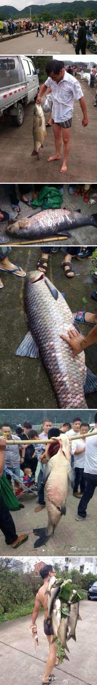 | 浙江黄岩一水库6年首泄洪 冲出一人高大鱼 | |