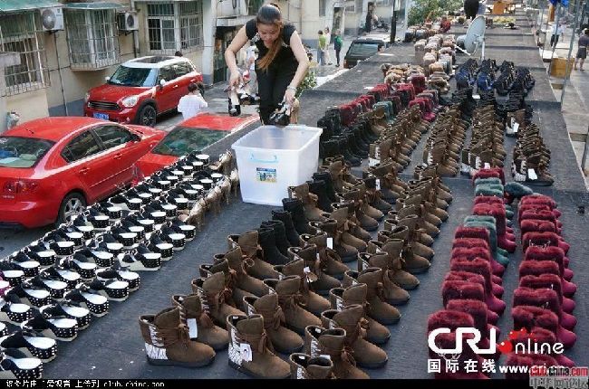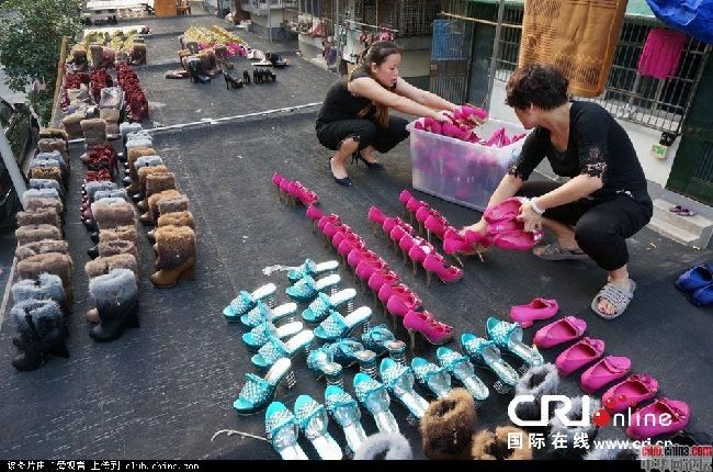 杭州一商贩雨后晾晒600多双被泡女鞋