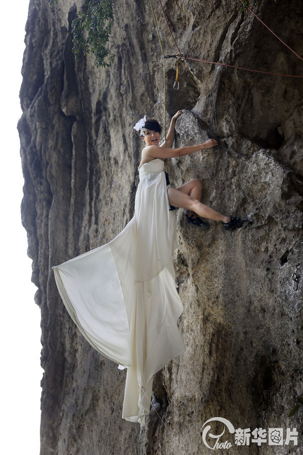“女汉子”穿婚纱攀岩 拍摄酷炫婚纱照