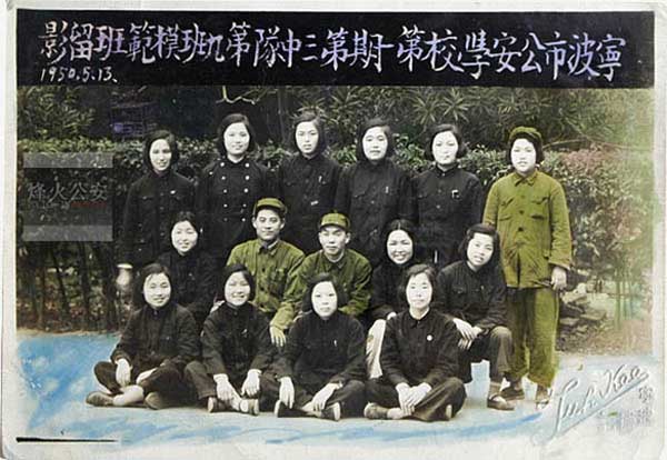 中排左二为照片提供者山东南下公安前辈戴子斌(时任校务主任)。他1949年从山东泰宁县公安局南下浙江。那个时代没有彩色照片,手工上色已经很是时尚了。