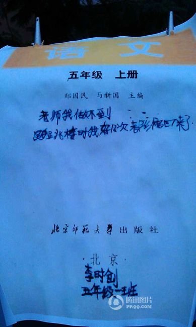 图为男孩在课本上曾经留言“老师做不到啊”。记者电话联系到孩子的父亲李先生,李先生表示正在与学校、当地教育部门协商处理此事。