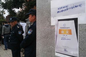 图为家长在学校门口粘贴材料为男孩讨公道。据传,孩子是成都某小学五年级学生,因搞朗读比赛说话被老师留下体罚,并逼写一千字检查,写不到就去跳楼,最后孩子选择跳楼身亡,孩子语文书上写着"老师我做不到,跳楼时我有几次都缩回来了"。