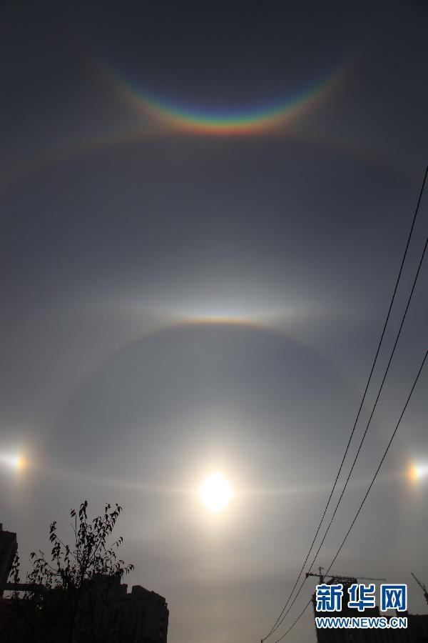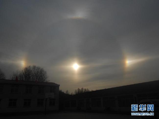 11月1日在河北承德隆化县拍摄的“幻日”景观。当日,全国多地出现“幻日”景观。“幻日”属于大气的一种光学折射现象,是由大气里的小冰晶折射太阳光形成的。 新华社发(郝长云 摄)