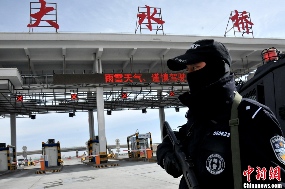 11月12日下午,京藏高速青海境内大水桥收费站,一名特警正持枪值勤。胡友军 摄