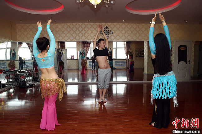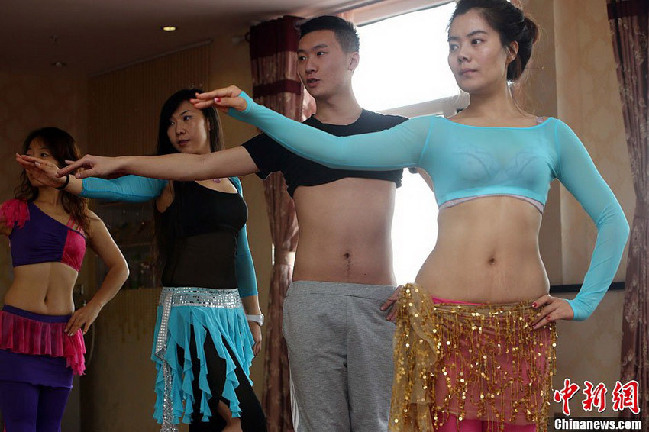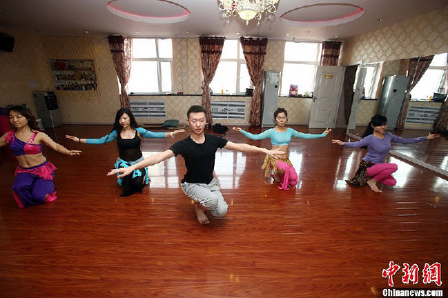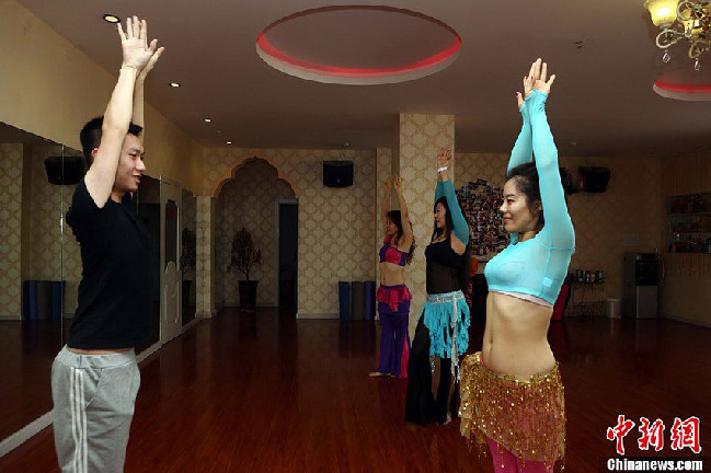 11月15日,在山西太原一家肚皮舞女子健身主题会,女学员们跟随着一位“90后”“90后”的男教练有节奏地翩翩起舞,年轻的男教练舞姿优雅、性感、妩媚,表情中洋溢着快乐与自信。(张云)
