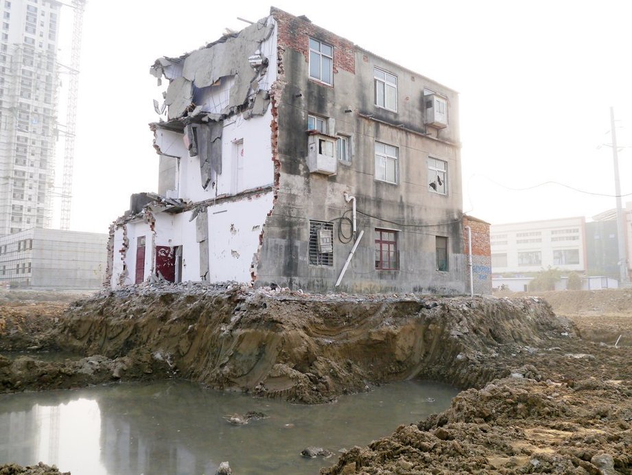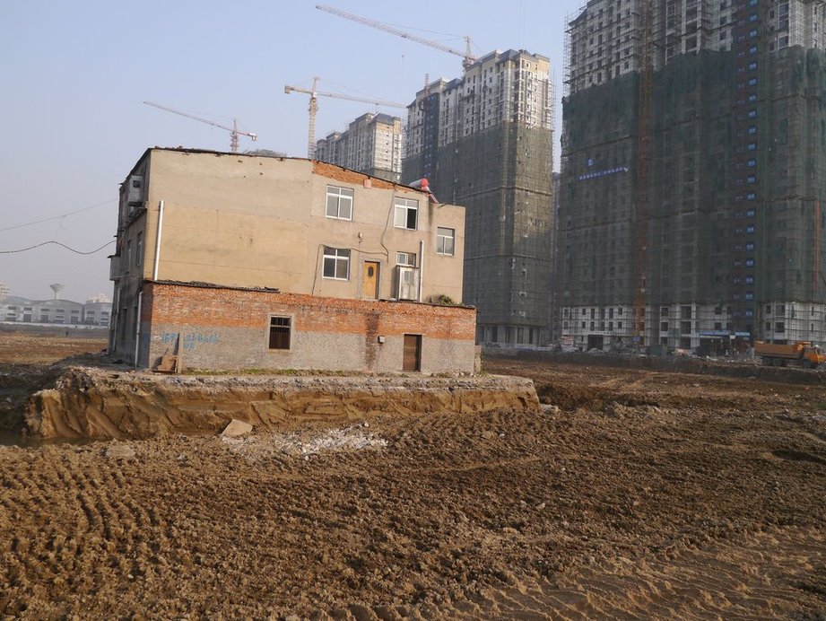 2013年11月19日,湖北省襄阳市,山水家园房地产开发项目二期工地,一栋三层民宅孤独地矗立在已被平整好的地块上,楼房周围被三米宽的水渠包围。
