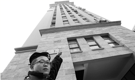 小区保安指着女人落下的窗户。 本报通讯员 祝原 摄