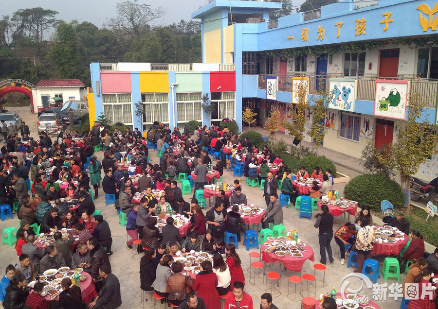 昨日是星期二,但金堂县云合镇中心幼儿园的100多个孩子都没有上学。不过,没有了孩子们的幼儿园却比平时更加热闹:一大早,锅灶就架起来了,桌椅也摆好了,门口的鞭炮也铺好了。临近中午时,幼儿园门口更是人声鼎沸,宾朋陆续赶来,一片喜气洋洋。