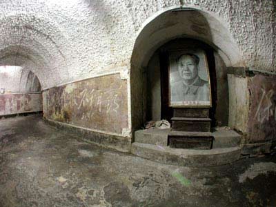 墙上的浮雕刻画着群众挖掘地下城的场景,书写着毛主席语录并悬挂着毛主席头像