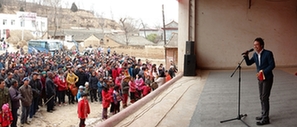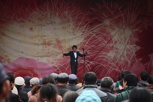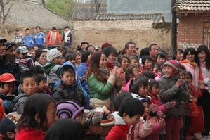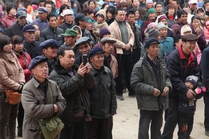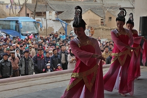 当天正值杨家寺乡逢集,十里八村的人们都聚拢到乡政府所在地杨家寺村购买所需物品。当演职人员做好演出准备,音响里传出的欢快音乐时,人们纷纷聚拢到文化广场。距开演还有一个多小时,但在活动现场记者看到,已有两三百名群众聚集在此翘首等待演出开始。小孩们穿着厚厚的棉衣棉裤在戏场里三五成群的打打闹闹;妇女们磕着瓜子在一旁说说笑笑;男人们也抽着烟在一起打趣闲聊,杨家寺村的文化广场上一派热闹景象。