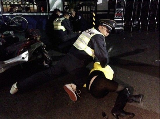 将车停在黄格线内,堵住了公交车进站入口,公交车驾驶员劝阻失败反遭醉汉围攻,民警接警处置,不料引来醉汉围堵派出所……昨日(12月3日)晚间,新民网记者亲历闵行区莘松路派出所门口被醉汉围堵,事件中有2名民警被醉汉打伤,1人被咬伤。7名闹事者被依法拘留。图为一名被摁倒的女子在地上百般挣扎。