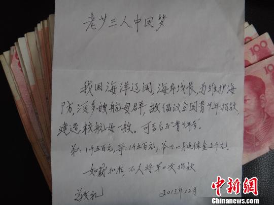 柳州团市委的工作人员拆开信封一数共有5000元民币。信封内附有一张纸条,上面写着:老少三人中国梦。我国海洋辽阔, 海岸线长,为维护海防,须多艘航母群,故倡仪全国共少年捐款建造核航母一艘,可否名为“青少年号”。弟:1千五百元;哥:1千五百元;爷爷一个月退休金2千元。如获批准,不久将第二次捐款。