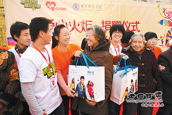 12月7日,甘肃政法学院的青年志愿者为安宁区水挂庄社区的空巢老人送去食用油、面粉、大米、羽绒服等生活用品。由腾讯游戏爱心联盟携手甘肃政法学院青年志愿者协会举办的“七彩丝带飘社区——关爱空巢老人”公益捐赠活动当日举行。