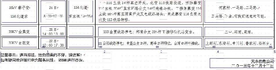 天水供电公司二0一三年十二月份停电检修计划表