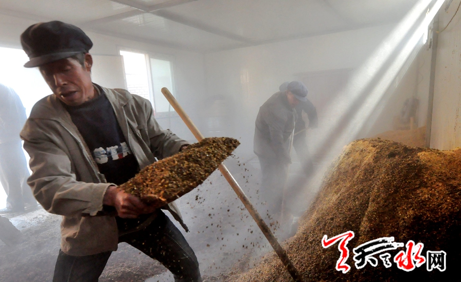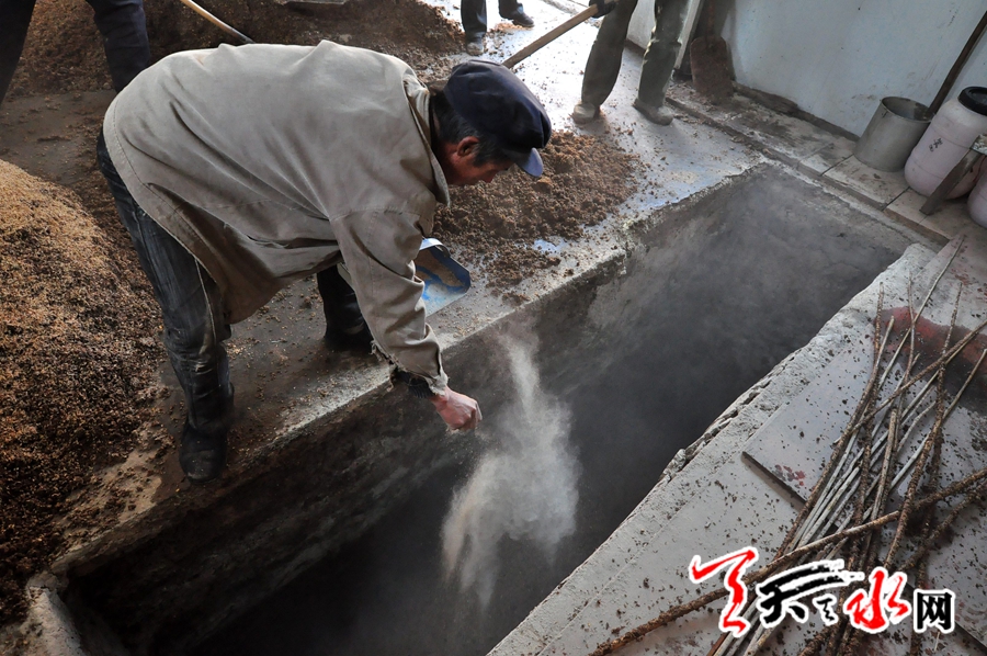 “村里九成以上的村民都姓杜,解放以后在天水及陇南开办的酒厂里的酿酒师傅大多都是从我们竹林村走出去的”,12月12日记者走进有着悠久酿酒传统的秦州区秦岭乡竹林村采访时一位杜姓村民说,因这些年村里多数青壮年劳力外出打工,村里目前就剩一户人家还保留着这种传统的酿酒作坊,在维系着竹林村手工酿酒的传统。记者寻着村民指引的方向,走进飘散有酒香的这间农舍时,酒糟在铁锹的不断翻铲下,发酵后的五谷发生着质的变化,不断升腾的蒸气伴着浓浓的酒香顷刻间把在这里忙碌的几个农民置于“仙境”之中,在这里你会体味出推杯换盏、觥筹交错之外的传统酿酒的结构美、个性美、风味美、意境美的酒之美学内涵。作为一种重农业文化的反映,中国酒之所以历经数千年的沧桑巨变而不衰,其生命力还表现在有着延承不衰传统酿造的工艺上,与充盈于现代高科技的酿酒技术相比,这种有着历史渊源且流传于民间的传统手工酿酒工艺更能体现出“香为酒之形,味为酒之魂,触为酒之体”的酒之内美。