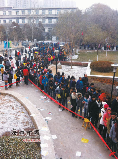 每日甘肃网-兰州晨报讯(记者魏娟)12月20日,2014年甘肃省普通高等学校美术与设计学类专业统一考试在西北师范大学开始报名。报名首日,天空飘着雪花,来自全省各地的美术类考生在西北师大体育馆报名点门前,排起了4列长长的队伍,他们大多要排队等候两个多小时才能报上名。