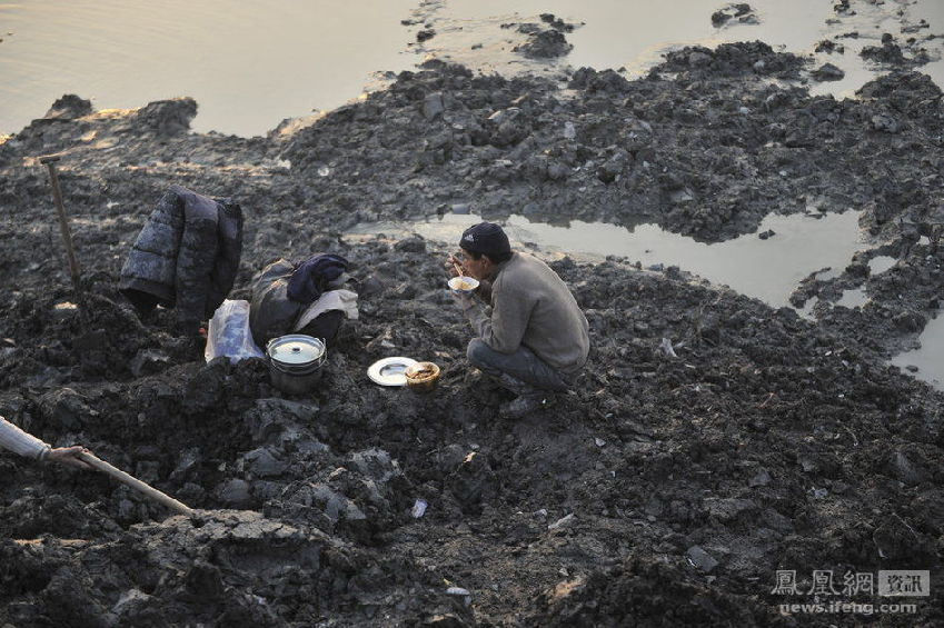 傍晚5时许,太阳渐渐落山,挖宝现场开始来了很多给丈夫送饭的妇女。半小时后,天渐渐黑了下来,挖宝的村民纷纷点亮头顶上的矿灯,霎时间,水阳江边灯光闪烁。“晚上继续,一直要到夜里12点。”一个村民告诉记者。记者从警方了解到,他们每天都会派人蹲守,但警力有限,有其他案件时就脱不开身。