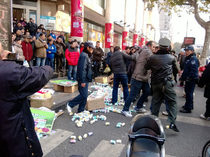 12月21日上午,浙江杭州庆春路,几名商贩因非法摆摊与执法人员引起纠纷,摊贩发飙推翻摊位,并举起整箱口香糖多次砸向执法人员。