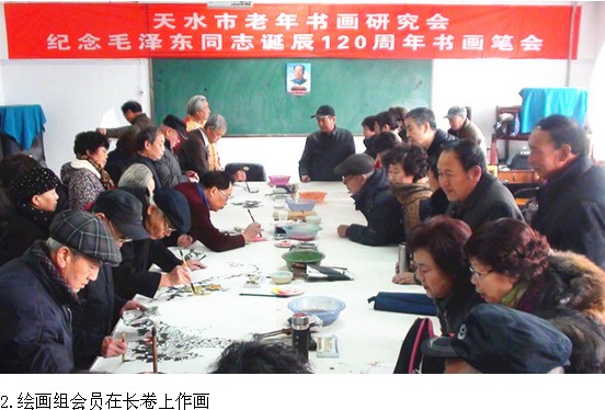 2013年12月26日, 天水市老年书画研究会举办纪念毛泽东诞辰120周年书画笔会, 创作了两幅长卷, 以此表达对伟人毛泽东及其丰功伟绩的崇敬之情和缅怀之意, 以示要在党的十八届三中全会精神指引下, 紧密团结在以习近平同志为总书记的党中央周围, 为实现中国梦传递正能量. 努力作出新贡现.