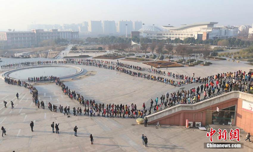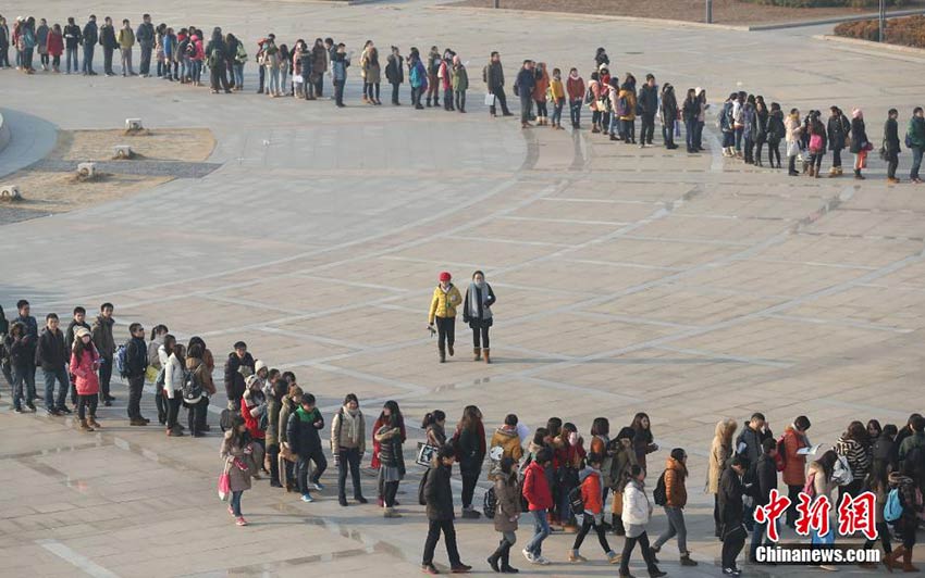 12月29日早上,南京财经大学图书馆门口,大学生排起了长队有序进入。随着气温的下降,安装有空调等取暖设备的图书馆、教室成了大学生们周末看书自习的最佳去处,而固定的座位数使得不少学生纷纷早起,顶着寒风排队等候开放进入,场面堪比春运。中新社发 泱波 摄